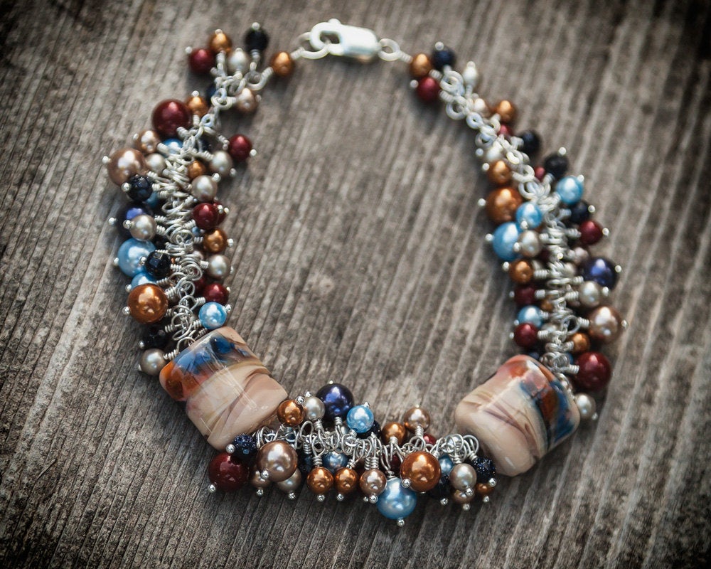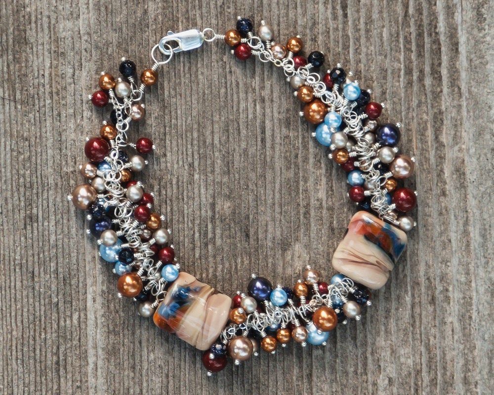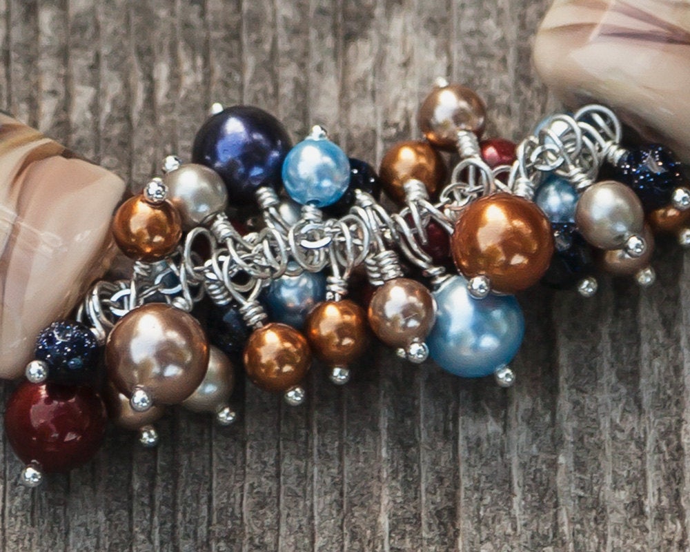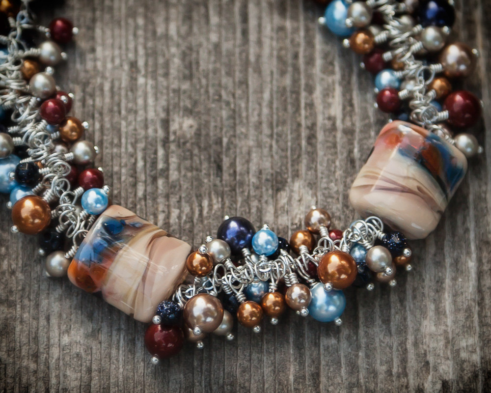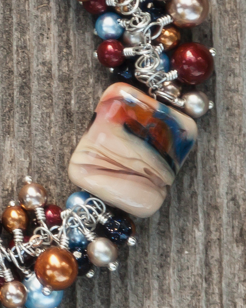 There is just something about the richness and beauty of genuine Swarovski pearls that is unmatchable. I started with two “Vanilla Latte” Artisan handmade glass nuggets and matched them with pearls done in colors that remind me of the trees on a beautiful fall afternoon here in northern Minnesota. I also tossed in some sparkling indigo blue Goldstone to add a little extra pop of shimmer here and there.